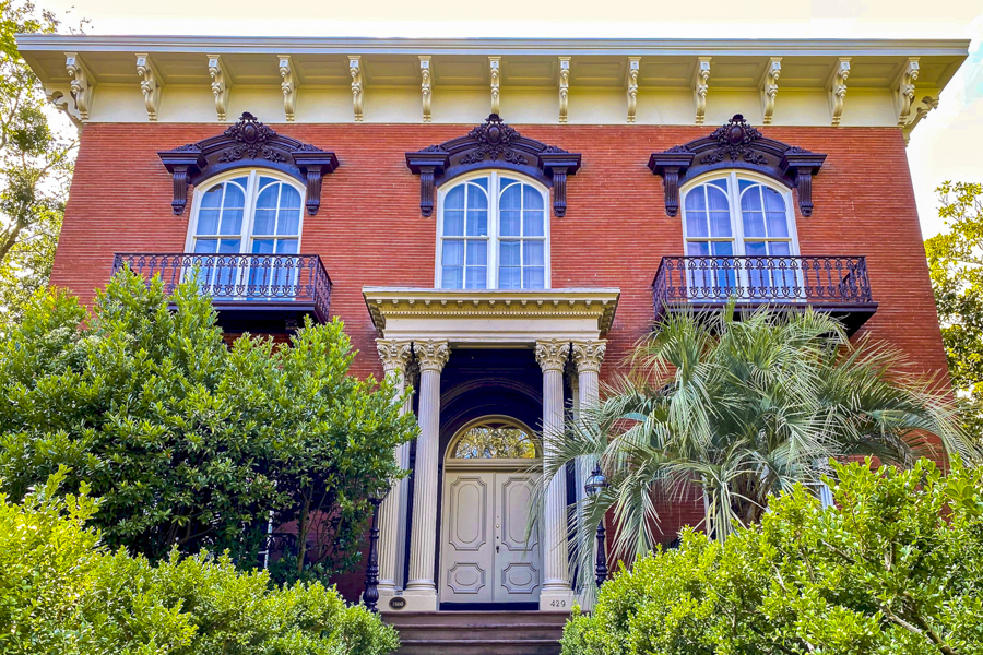 La façade principale, donnant sur Monterey Square, est sans doute l'une des plus photographiées de Savannah, particulièrement belle au lever du Soleil lorsque la lumière dorée caresse la brique rouge et fait ressortir les détails en fonte. L'escalier d'entrée, les persiennes sombres et la végétation qui encadre la propriété ajoutent encore à l'atmosphère romantique et aristocratique de ce joyau architectural.
